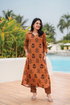 Make a bold yet earthy statement with Muds Tone a thoughtfully designed co-ords set that blends artisanal prints with everyday comfort. Crafted in breathable viscose this set features a warm orange base highlighted with striking black botanical motifs paired with rhythmically patterned bottoms for a contemporary contrast.