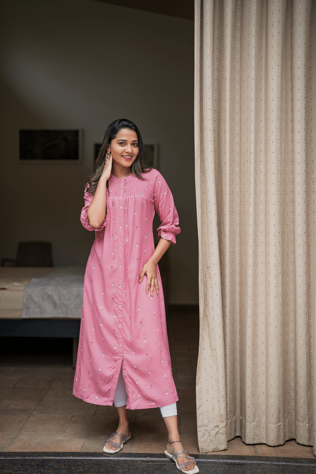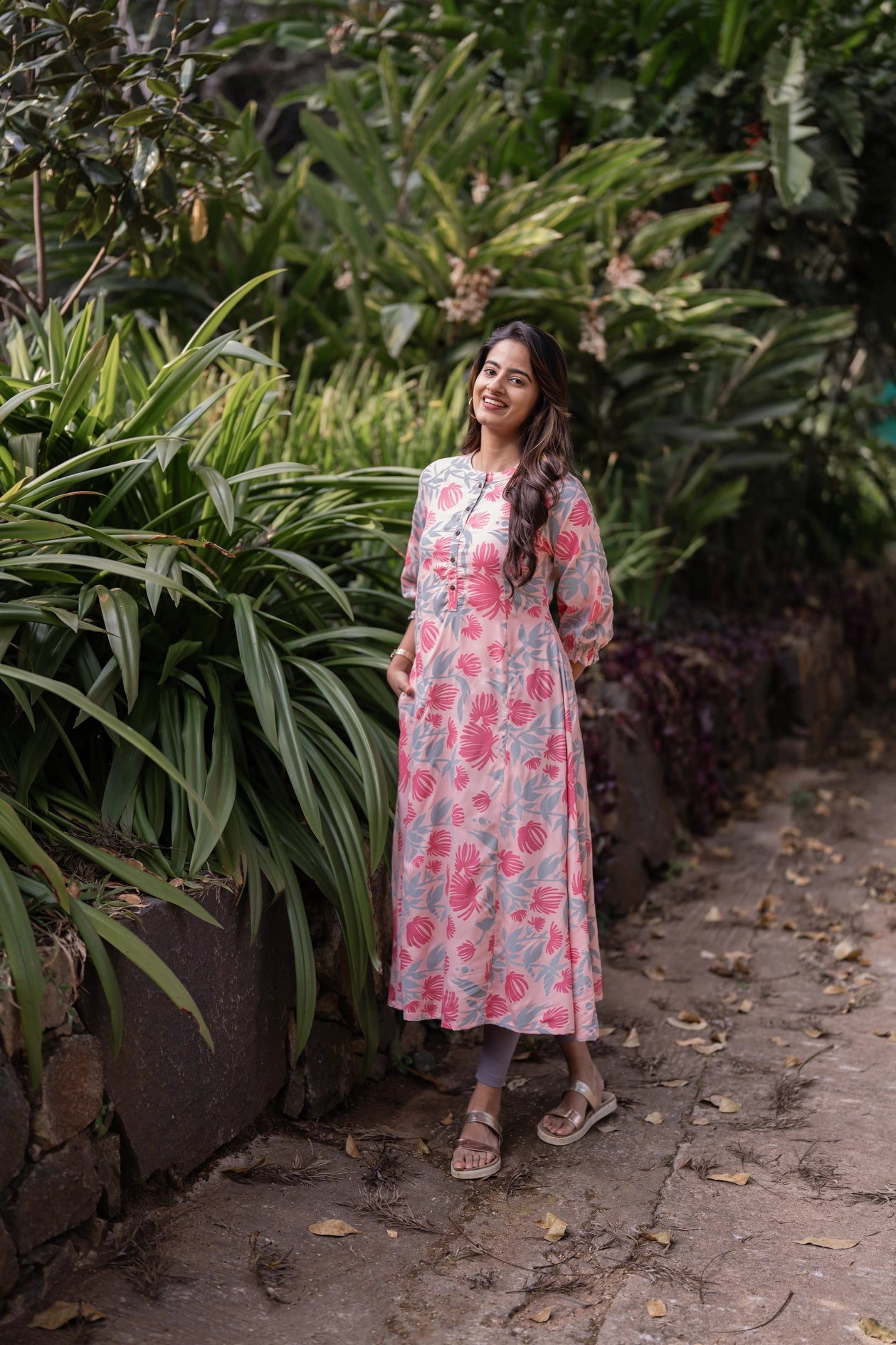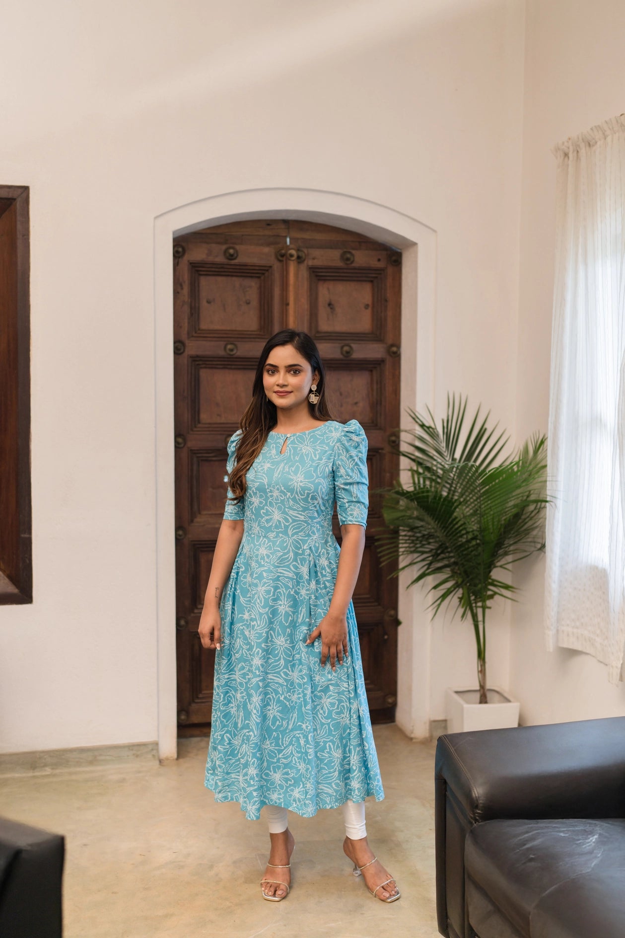 Pinecone Teal Blue Viscose Blend Kurti with Pot Neck & Puff Sleeves