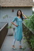 This lively aqua blue kurti is crafted from soft, breathable viscose and features a vibrant floral pattern in pink and white, bringing a cheerful touch to any outfit. The kurti has a square neckline and short puff sleeves, adding a trendy, modern vibe. The side slits enhance mobility and comfort, making it ideal for casual outings or day-to-day wear.
